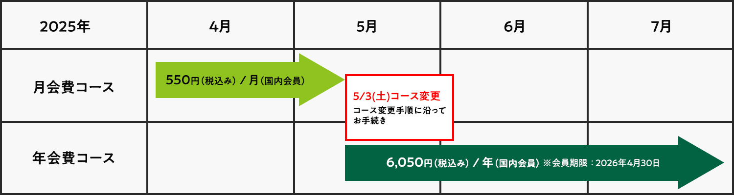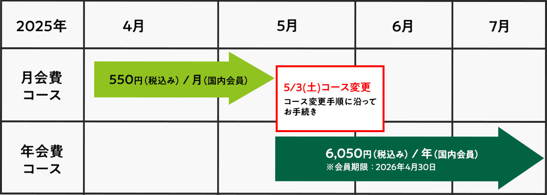 ▼2025年5月3日(土)に年会費コースへコース変更した場合