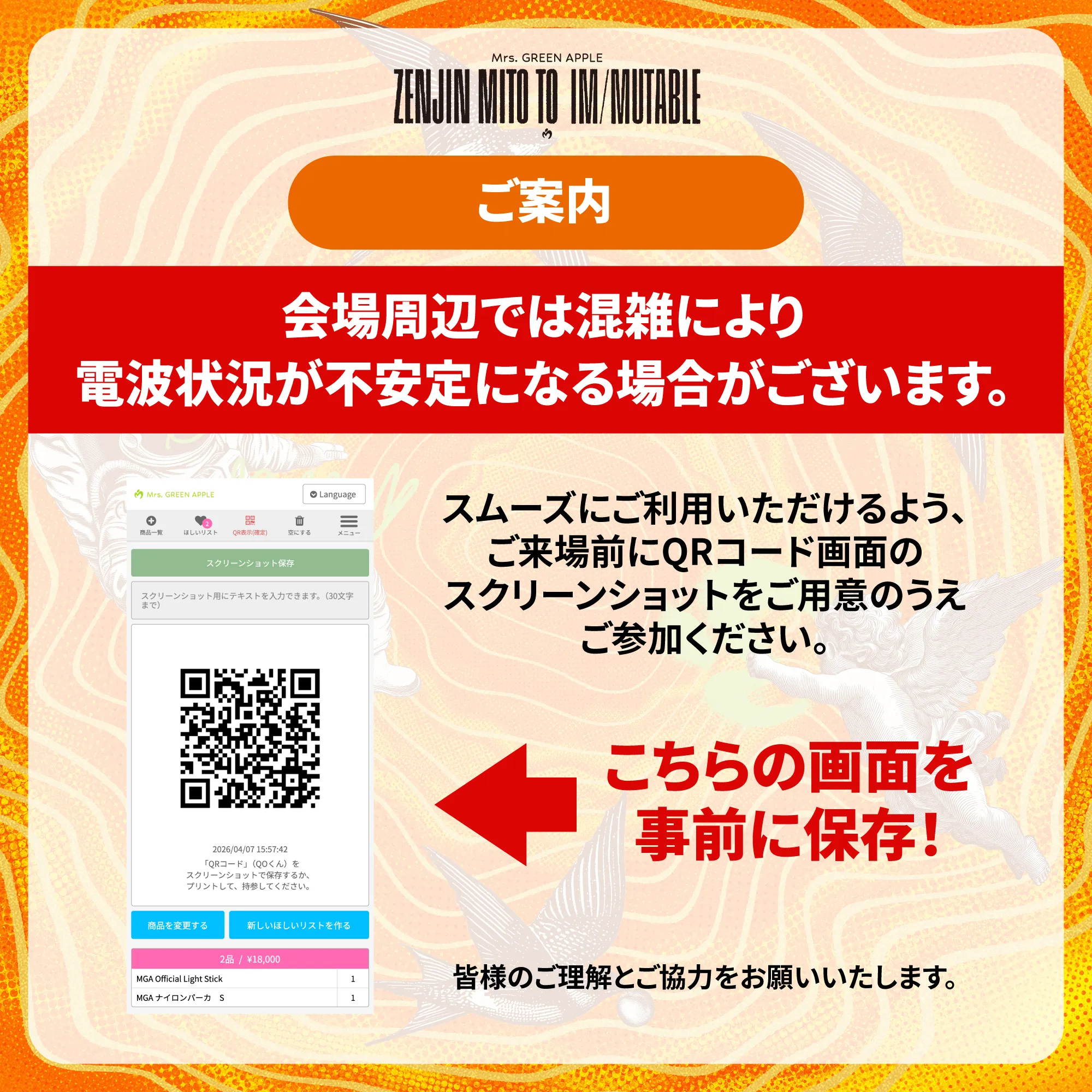 開場時間の前後は会場が大変混雑し、インターネットに繋がりづらくなる場合がございます。公演前日までに通信環境の良い場所で、下記の2点を必ずご確認ください。