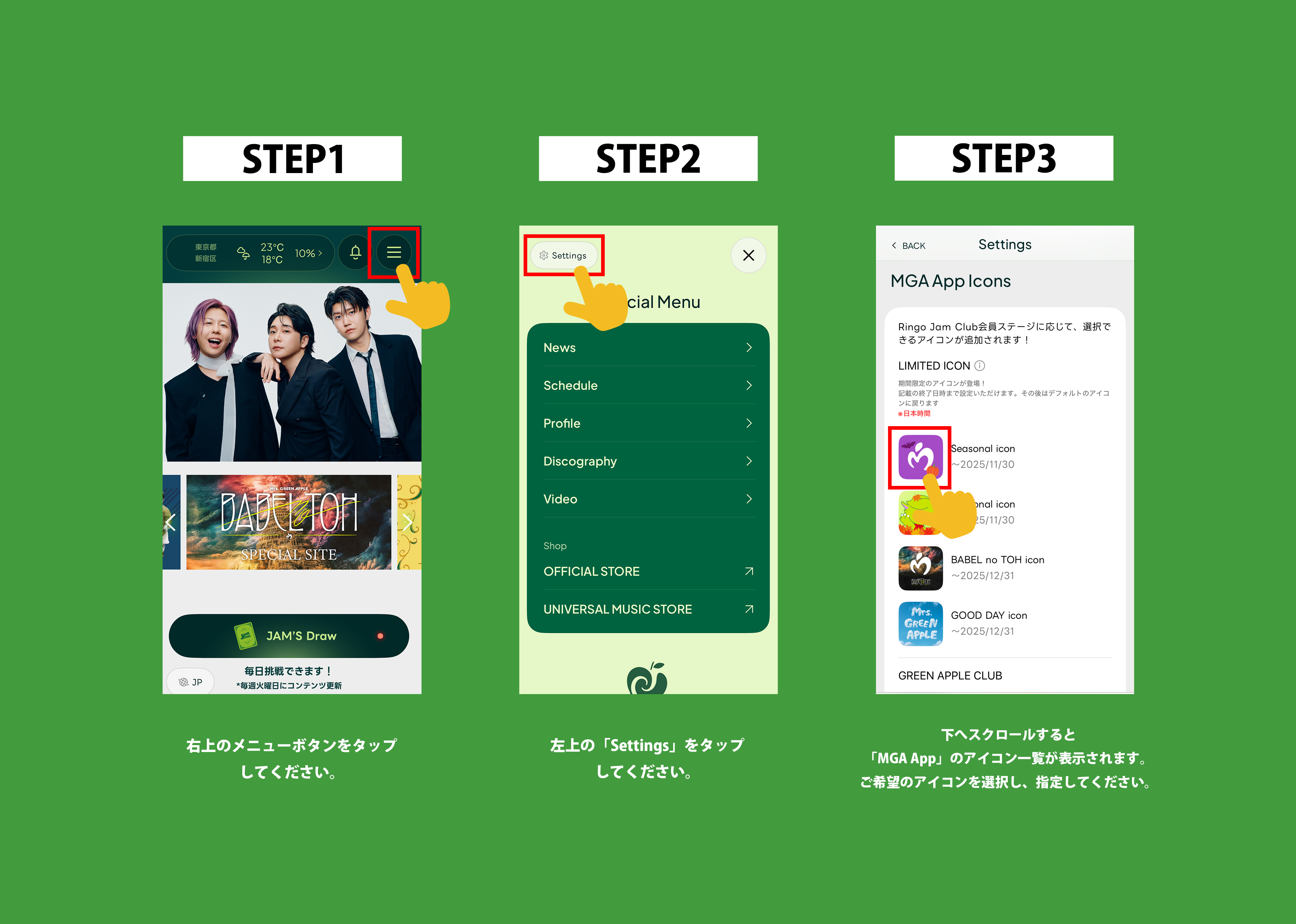 「LIMITED icon」はメニュー内上部の「Setting」ボタンより変更が可能です。