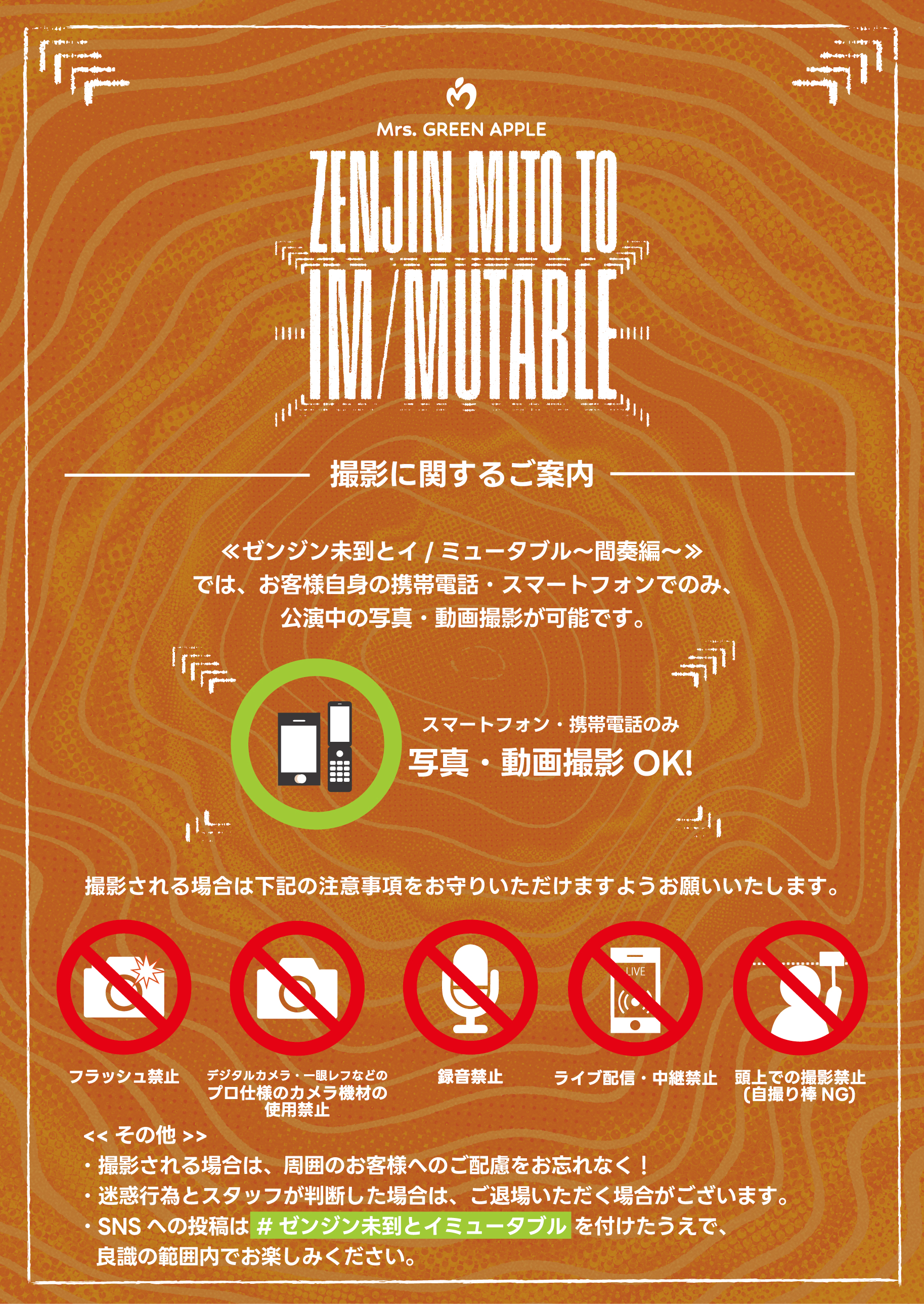 ≪ゼンジン未到とイ/ミュータブル〜間奏編〜≫では、お客様自身の携帯電話・スマートフォンでのみ【公演中の写真・動画撮影を可能】といたします。撮影された写真・動画は各種SNS・ブログ等への投稿もOKとなります。